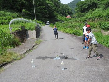さあ、いよいよペットボトルロケットを飛ばします。ペットボトルの中に水と空気を入れて飛ばしました。まっすぐ飛んだもの、斜めに飛んだものなどがありましたが、自分たちで作ったロケットが無事に飛んでよかったですね。
